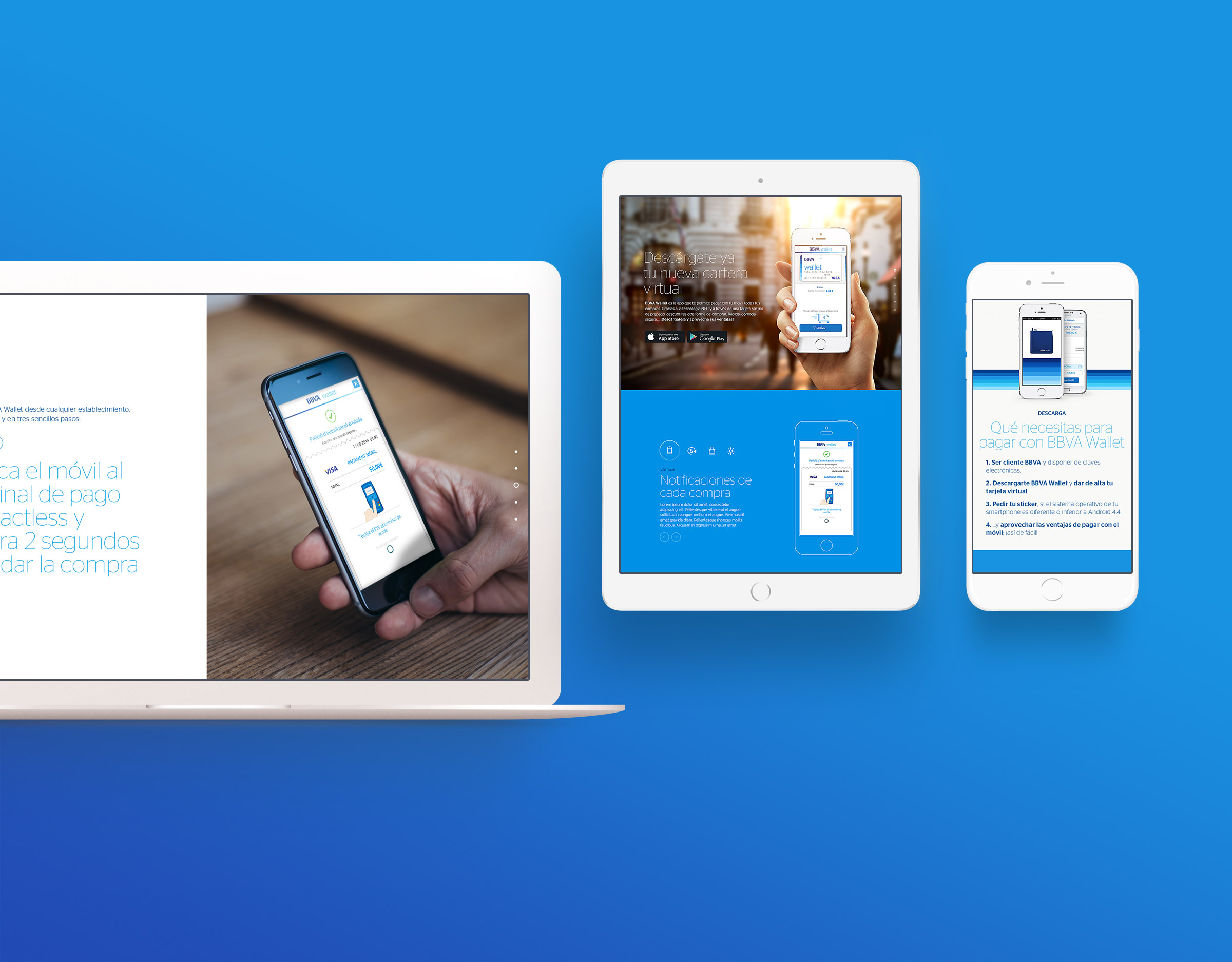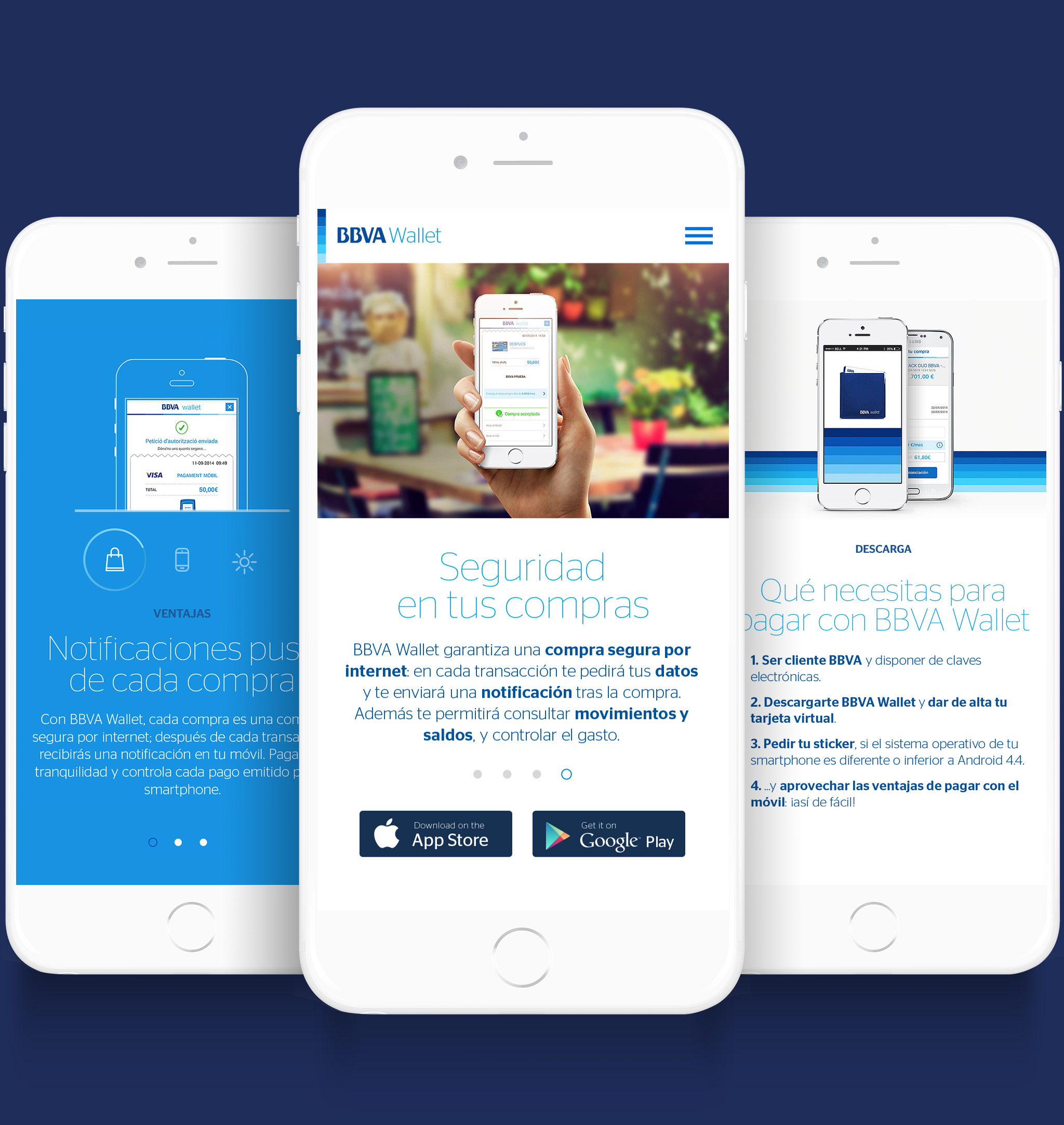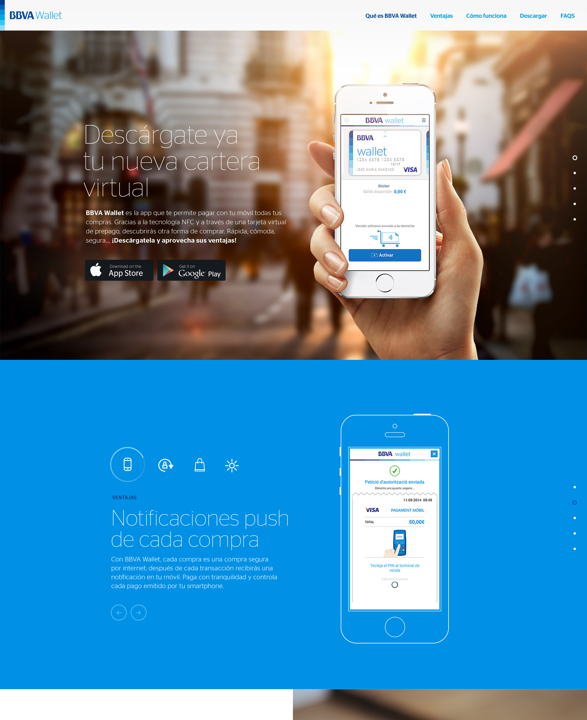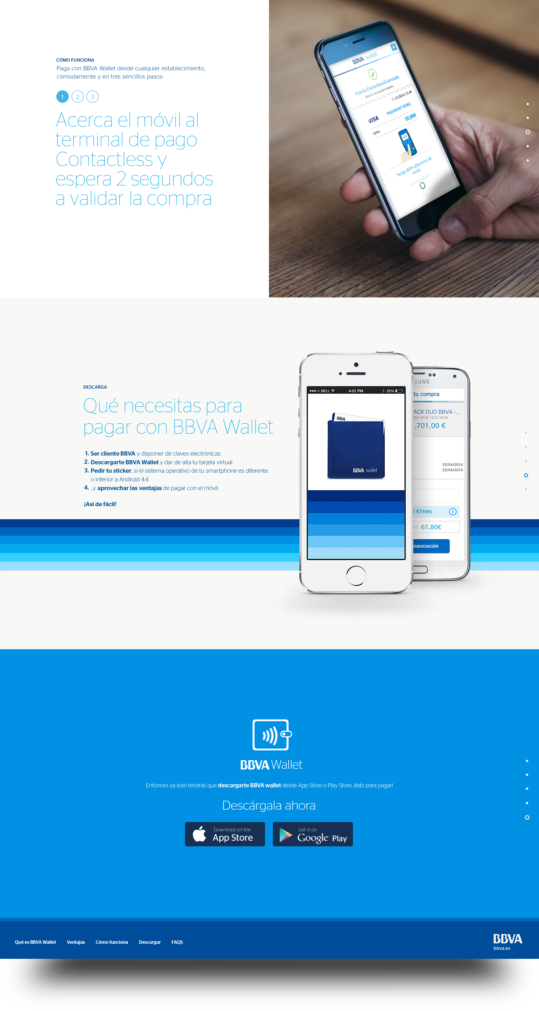 Launch website for BBVA Wallet product, a BBVA app that lets users make payments with their mobile phone, as well as managing their credit cards and transactions. The client briefing stressed two essential aspects: we had to design a very visual, advanced tool, and at the same time simple and clear, to make navigation easier while building up trust with users.