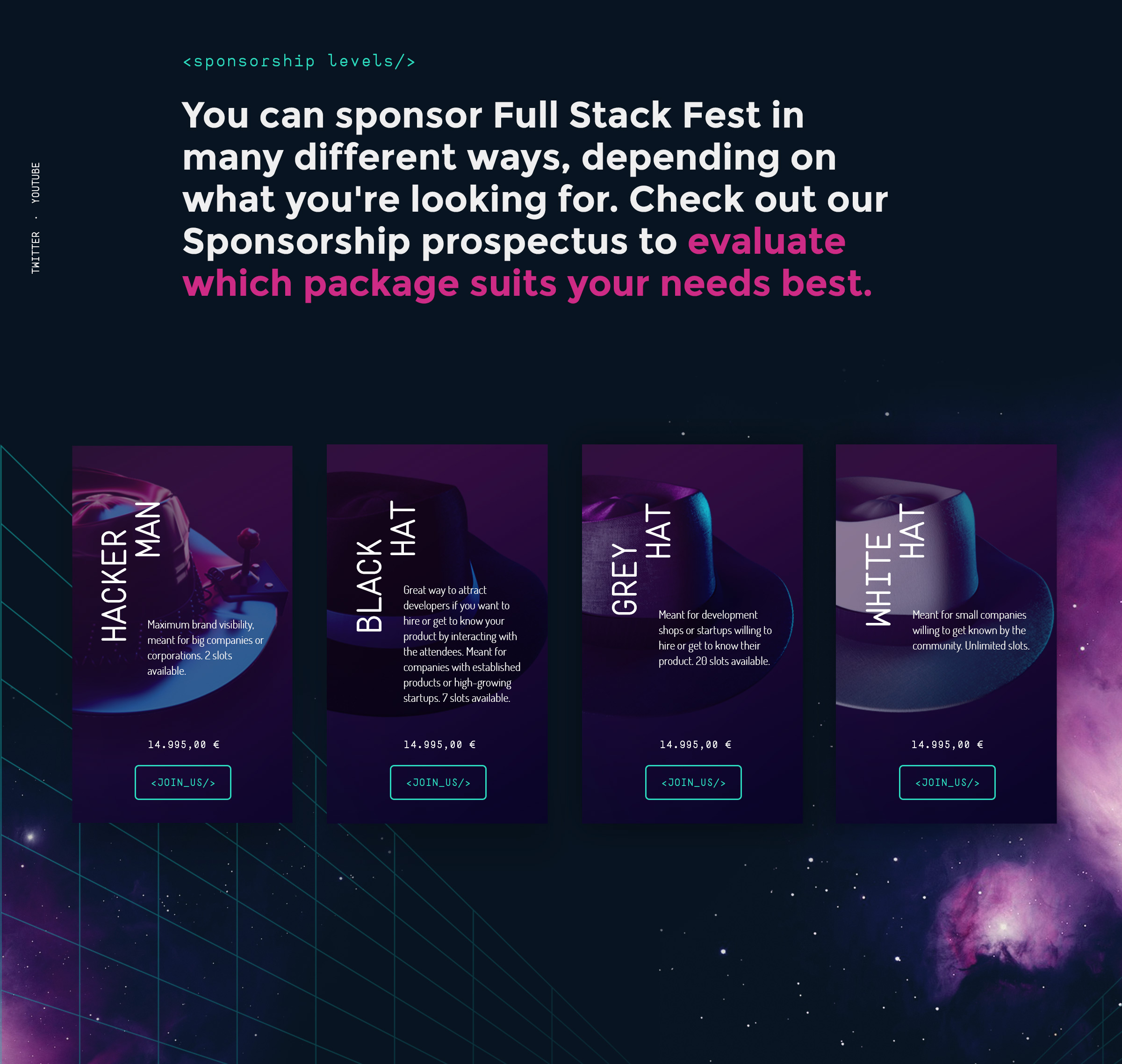 The website UX approach revolves around a very specific user; front-end and back-end developers. The visual concept and the development of interactions has a twofold objective: on the one hand fostering the technological approach through the recreation of a retro-futuristic world inspired by pop culture icons like Blade Runner, Daft Punk, Tron, Atari, Mr. Robot; on the other hand, making browsing and interaction easier for the user through a simple and accessible structure and usability, providing a positive and satisfactory navigation experience.